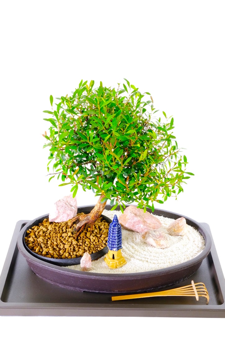Gorgeous miniature-leaved beginner’s indoor Roseapple/Myrtle Zen Garden which flowers & fruits. Create your own peaceful scene with bamboo rake, drip tray, pink rocks, white sand & a colourful pagoda of your choice.