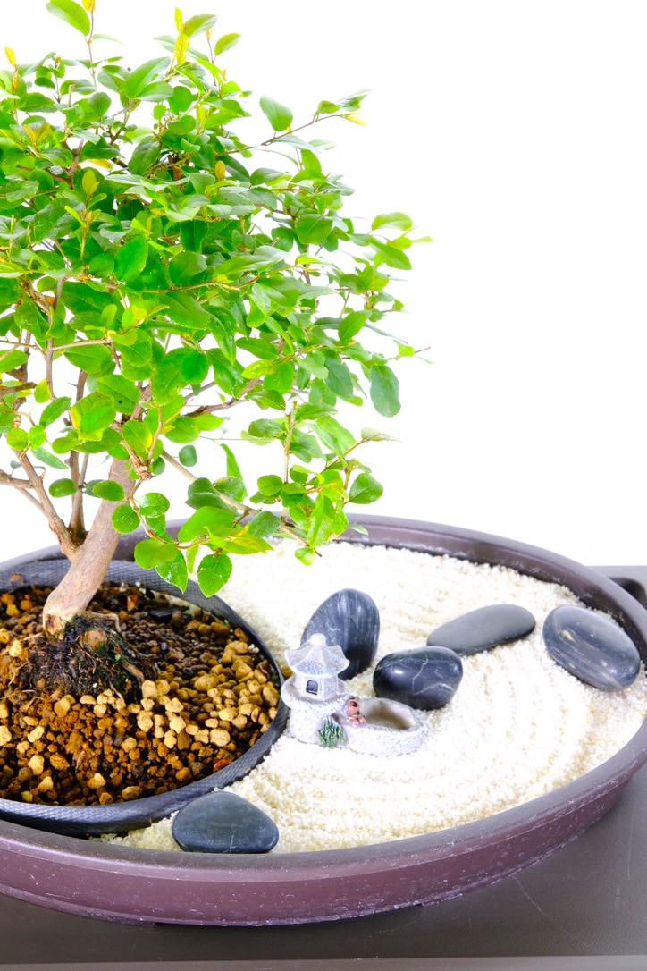 The Garden of Reflection offers a unique experience as we present to you a Sageretia theezans bonsai, carefully cultivated to showcase its fruiting variety. This exceptional bonsai is potted in premium Akadama soil, renowned for its ability to enhance root development and nutrient absorption. To evoke the calming essence of a Zen garden, the bonsai is accompanied by a bed of white gravel that flawlessly mimics the appearance of pristine sand.