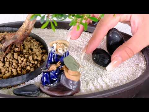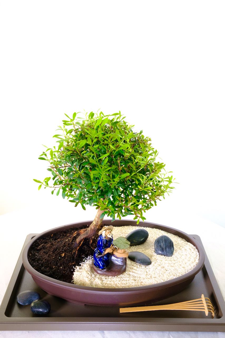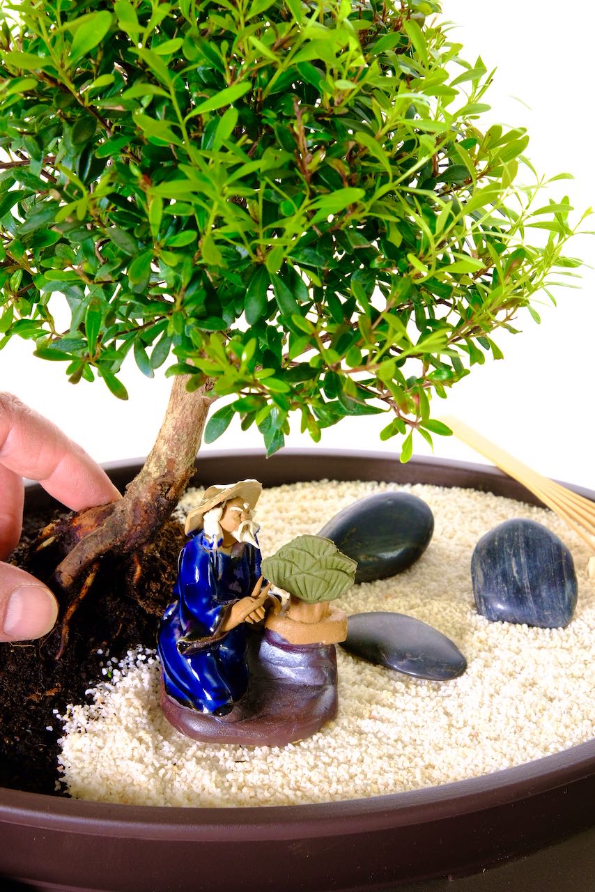 A beautiful miniature leaved beginners indoor Roseapple/Myrtle Zen Garden which flowers & fruits. A creative bonsai garden with bamboo rake, drip tray, polished black rocks & white sand to create your own garden. A glazed oriental figurine relaxing and enjoying the pruning of a bonsai tree is included (the colour of the figure may vary). Enjoy the creativity and the space in your mind to enjoy this pretty zen garden.
