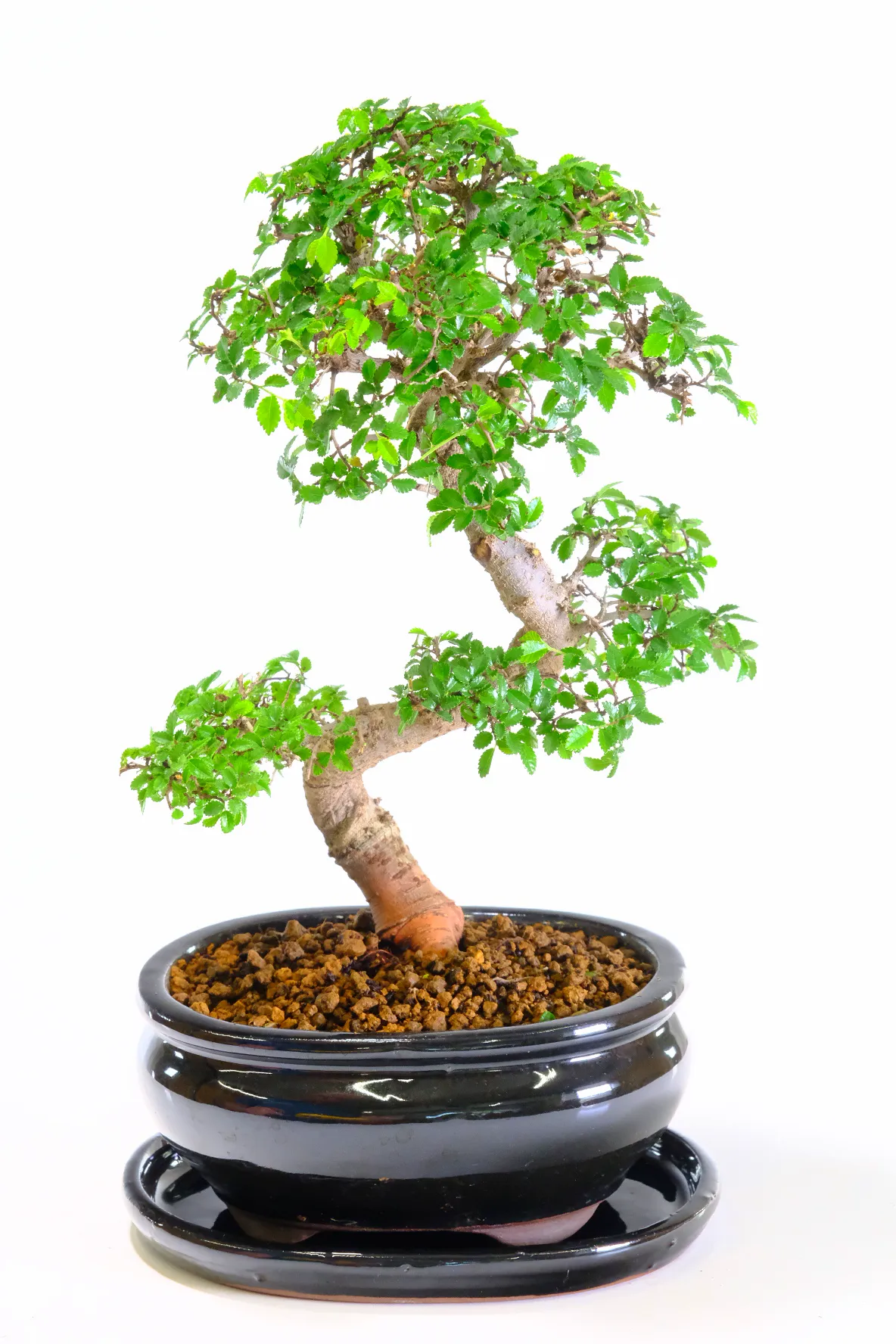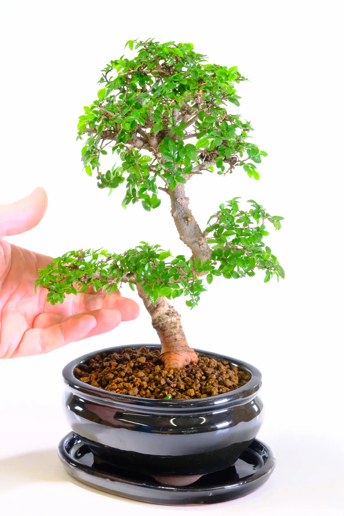 This dwarf excellence range 9-year-old Chinese Elm bonsai (Ulmus parvifolia) is a striking premium specimen, showcasing an outstanding three-dimensional zig-zag design that brings movement and personality from every angle. The trunk flows confidently with sharp, artistic turns, while the lower section displays beautiful cork bark, adding age, texture, and character.