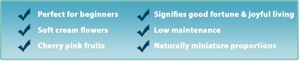 Personally, I think this bonsai is highly under-rated. We love it. The proportions are sensational with naturally miniature leaves. I love the fact that it both flowers and fruits and the blooms are a very pretty soft ivory almost semi-double in form. Cherry like fruits are a cheerful pink. The bark is a warm red in tone. It is one of the easiest bonsai to grow and is fairly tough so can live outside also for much of the year – although we do recommend protecting from frosts.
