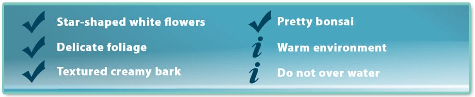 The Tree of a Thousand Stars (Serissa foetida) is a lovely indoor bonsai variety. It displays an abundance of beautiful star-shaped small white flowers during mid-late summer.